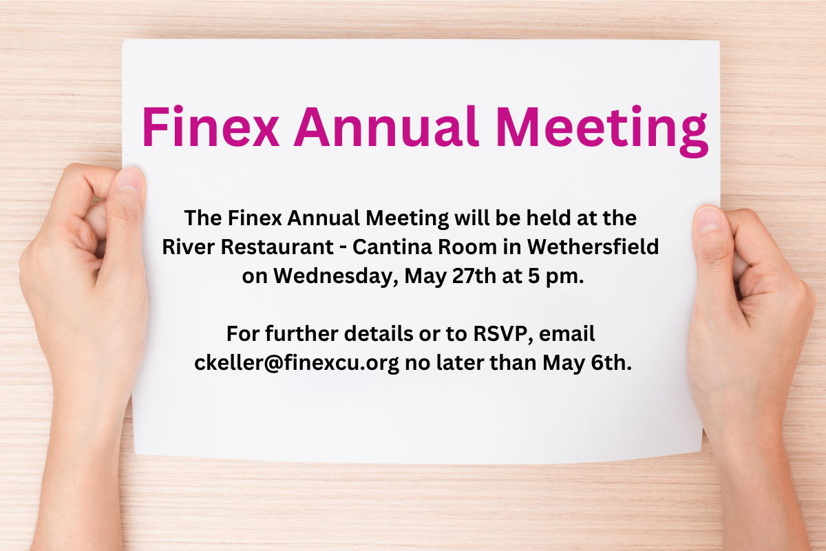 Finex will be holding its Annual Meeting at the River Restaurant - Cantina Room in Wethersfield, CT on May 27, 2026 at 5 pm. Advanced registration is required. If interested in attending, please RSVP by emailing ckeller@finexcu.org by May 6, 2026. Share